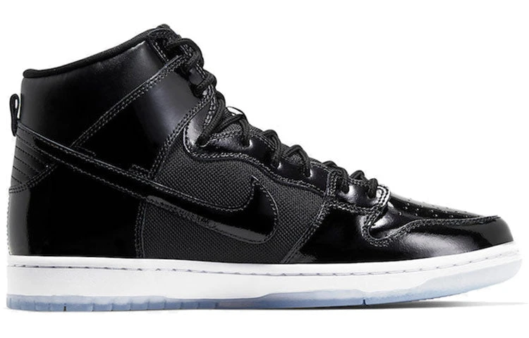 The Nike SB Skateboard Dunk High is a sneaker that pays homage to the classic Air Jordan 11. It features a black upper constructed from shiny patent leather, with ballistic mesh at the quarter panel and full-grain leather on the collar. A subtle pop of royal blue appears on the tongue tag, while the ‘SB’ heel branding recalls the ‘23’ on the Air Jordan 11. An icy translucent outsole completes the look.