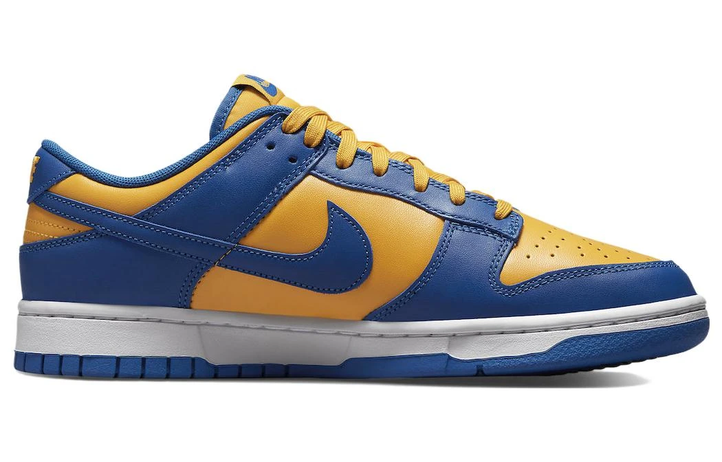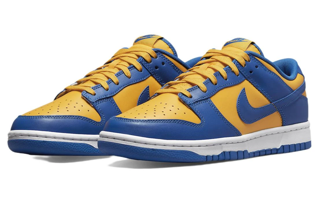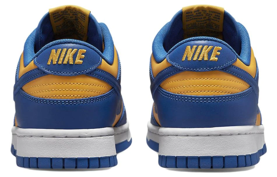 Make a statement on the streets in the Nike Dunk Low UCLA. Innovatively designed to perfectly replicate the colors of University of California Los Angeles, this sneaker features a golden and blue upper made from a supple leather that slides into laces, allowing you to securely lock your foot in place for maximum comfort. Topped off with signature blue detailing on a golden tongue and contrasting white midsole for an airy break, capture all eyes with this stylish pair no matter where you walk. Make sure your next move is on point and make it with the Nike Dunk Low UCLA.