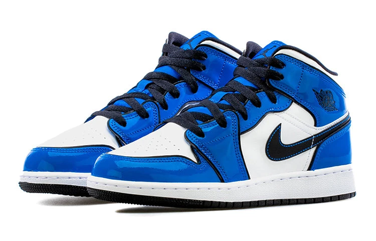 The Air Jordan 1 Mid SE GS ‘Signal Blue’ is a mid-top sneaker that features a unique design that accentuates the sneaker’s classic lines. The black trim surrounds shiny patent leather overlays finished in a vibrant shade of blue, allowing the details to further stand out from a white leather backdrop. Additional black accents land on the signature Swoosh and woven tongue tag, the latter featuring standard Jumpman branding. The mid-top rides on a rubber cupsole, complete with a traction pattern designed for pivoting on the hardwood.