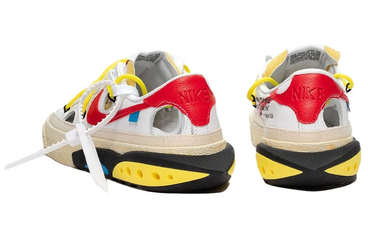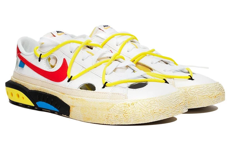 The Nike Blazer Low x OFF-WHITE is a radical take on the classic silhouette. Featuring a white leather upper with yellow cord lacing, the sneaker is accented with crimson Swoosh branding and Off-White’s signature screen-printed text. The textured rubber midsole is pre-yellowed for a vintage look, and the sneaker is finished with a molded yellow piece that extends past the heel.