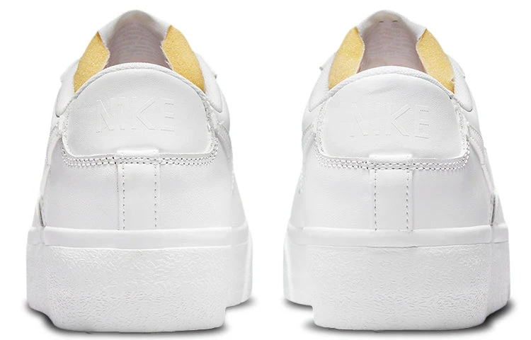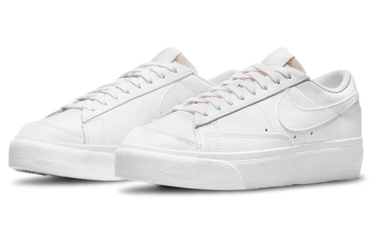 Step onto the scene in fashion wearing the Nike WMNS Blazer Low Platform Triple White shoes. These vintage-inspired platform sneakers have been designed with a crisp white leather upper, featuring a retro Swoosh, reinforced overlays and an exposed foam tongue. Adding to the classic look are tonal Nike branding on the heel tab and woven tongue tag. The low-top also features a rubber platform midsole for maximum comfort, plus a rubber outsole with herringbone traction pattern for optimal grip. Perfect for any everyday street style ensemble, these unique shoes from Nike will take your look from basic to ultra-cool. Get out and show your statement style wearing the Nike WMNS Blazer Low Platform Triple White shoes.
