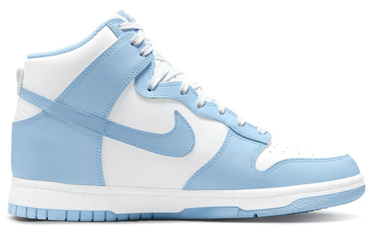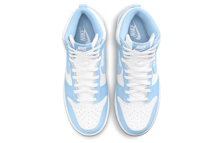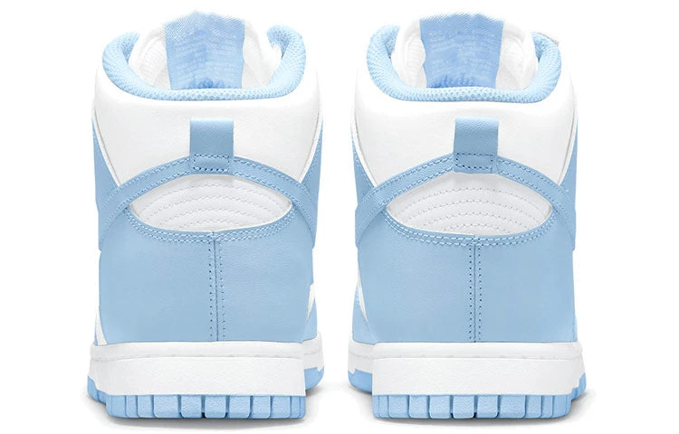 Dressed in a White and Aluminum color scheme. This Nike Dunk High features a White leather base, nylon tongues, and midsole paired with Aluminum Blue – not University Blue – leather and Swoosh overlays. The same light hue continues on the laces, liner, tongue labels, insole, and rubber outsole completes the design.